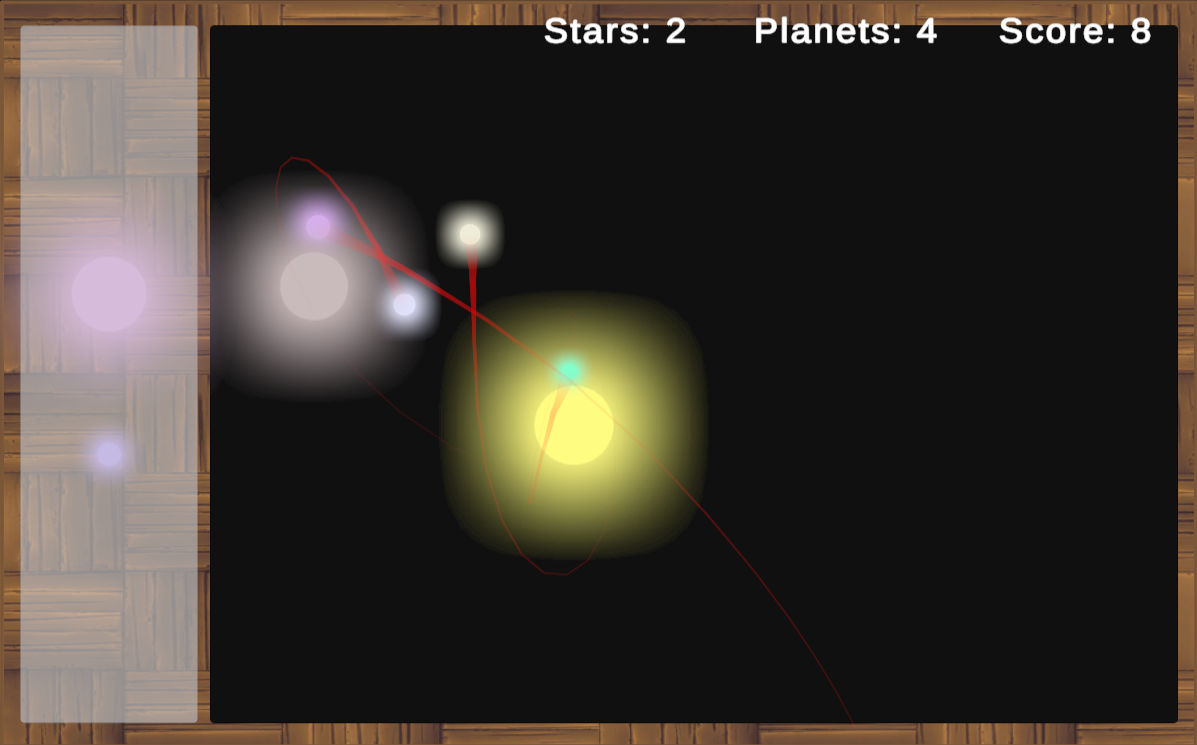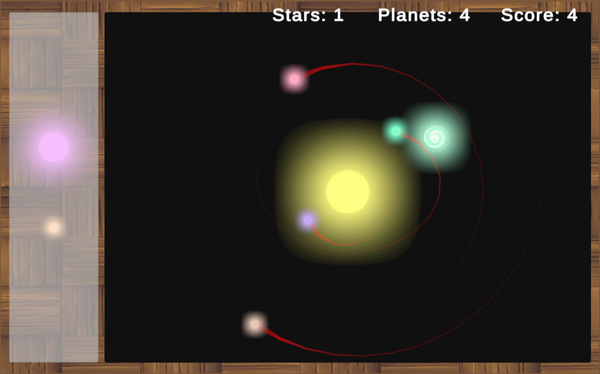 Two of the glowing circles on the left side of the screen are a star and a planet each.